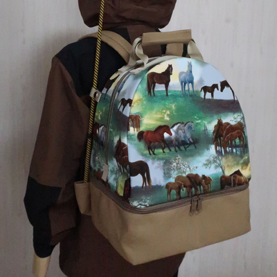 馬柄ファブリックで仕上げたリュック上層にはヘルメットや衣類、無地の下層にはジョッパーブーツやチャップスなど、一緒にしたくないものを分けて収納できる乗馬用リュックです。ジョッパーブーツご愛用の方におすすめです。