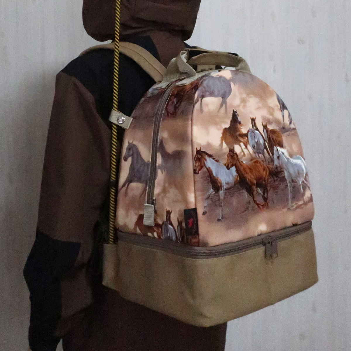 馬柄ファブリックで仕上げたリュック上層にはヘルメットや衣類、無地の下層にはジョッパーブーツやチャップスなど、一緒にしたくないものを分けて収納できる乗馬用リュックです。ジョッパーブーツご愛用の方におすすめです。