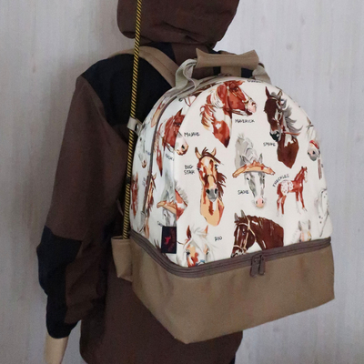 馬柄ファブリックで仕上げたリュック上層にはヘルメットや衣類、無地の下層にはジョッパーブーツやチャップスなど、一緒にしたくないものを分けて収納できる乗馬用リュックです。ジョッパーブーツご愛用の方におすすめです。