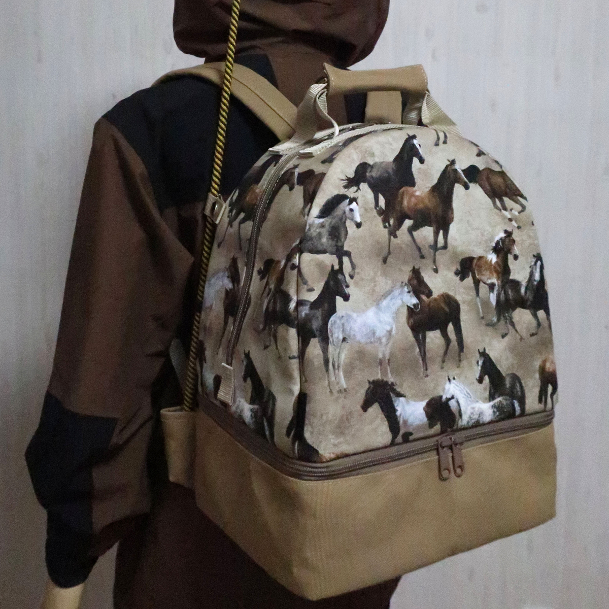 馬柄ファブリックで仕上げたリュック上層にはヘルメットや衣類、無地の下層にはジョッパーブーツやチャップスなど、一緒にしたくないものを分けて収納できる乗馬用リュックです。ジョッパーブーツご愛用の方におすすめです。